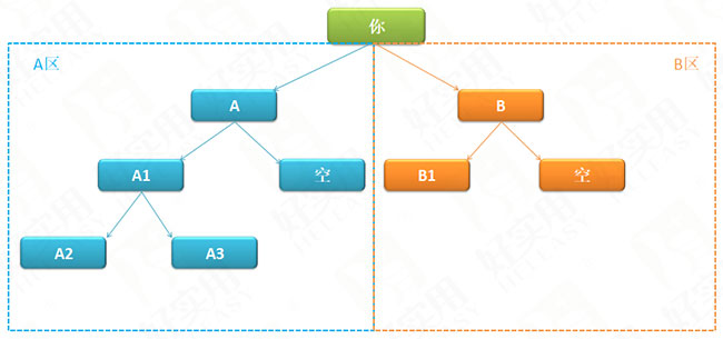 注意:蓝色部分是你的A市场(A区),也就是说,只要是在A的组织之下,都算你的左边的业绩,右边亦然!只要是B的网络组织之下,都算你右边的业绩,这样左边的业绩跟右边的业绩产生对碰就可以拿奖金!