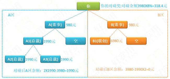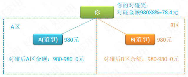 举例一:如下图所示,比如您今天有两个朋友跟你注册了会员,都是980元的董事级别,分别是A和B两个人,分别放在了您的A区和B区,这时您的A区为980元,您的B区为980元,在这种情况下,A、B两区就可以碰到980元的对,即左边:右边=A区:B区=1:1,您就可以得到980×8%=78.4元。此时您的A和B这两个客户的对碰已经碰完,不能再重复进行下一次碰对。